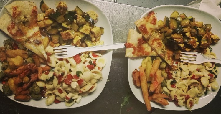 Orecchiette pachini, mozzarella, basilico; Dadolata zucchine con tofu e curcuma;