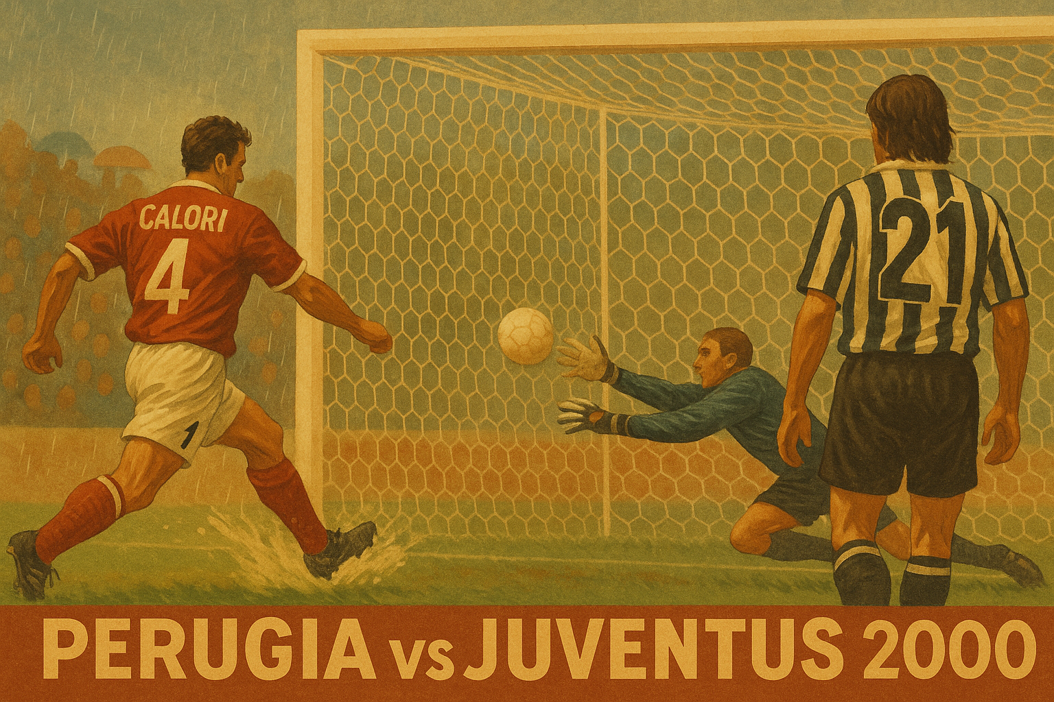 Il cielo sopra l’Umbria era scuro e pieno di nuvole cariche d’acqua. Si parte alle 15: la Juve attacca, ma dopo l’intervallo un vero diluvio trasforma il campo in una piscina di fango. L’arbitro Pierluigi Collina sospende il gioco per 73 minuti. Quando si riprende, al 49′ (4′ della ripresa “post-temporale”) il difensore Massimiliano Calori trova un tiro secco: Perugia 1-0 Juventus. Sul terreno zuppo la palla impazzisce, i bianconeri scivolano, Del Piero non trova spazio, Zambrotta si fa espellere. I Grifoni lottano e resistono. Finisce così.